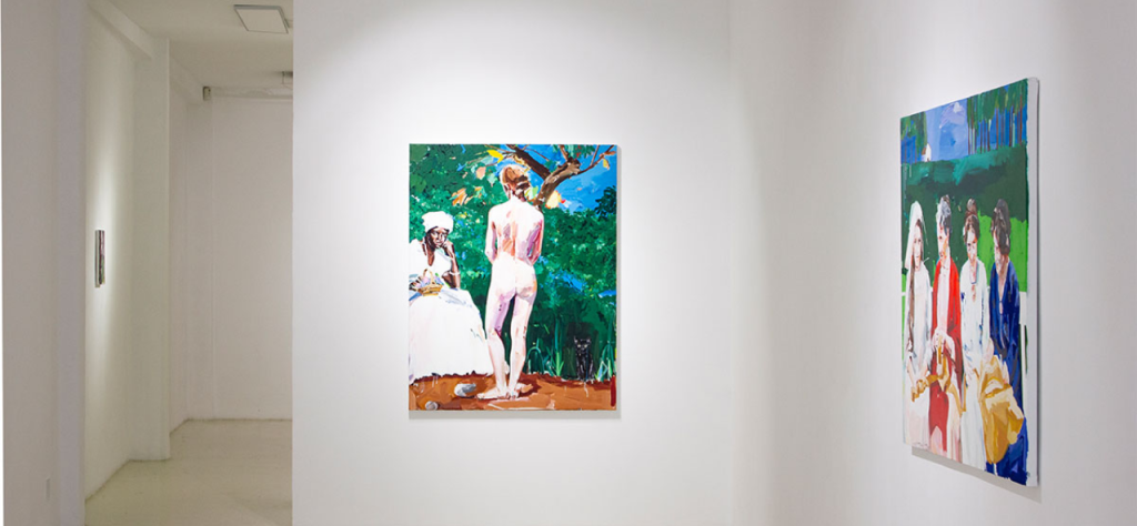 Desde la mirada desafiante de la Olympia de Manet, el desnudo femenino ha cambiado hasta convertirse en las ruinas desoladas de Chantal Joffe o Marlene Dumas. Pero la tradición era otra y el juego consiste en volver la mirada, girarse al pasado. Una pose académica, la figura de espalda, como el ángel de Caravaggio de La huida a Egipto, sirve para desactivar el propio desnudo que, en mitad de un bosque y aunque central en el cuadro, cede su protagonismo a la mirada de la mujer vestida que interroga al que contempla la pintura.